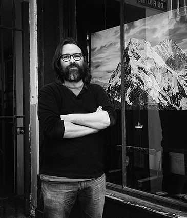 On y retrouve des lacs noirs sur lesquels parfois un personnage fluorescent apparaît. Le regard est happé d’abord par le grand format de la toile, puis ensuite par les thèmes traités. Chaque toile offre un sentiment familier, proche de nous par le choix des paysages, la forêt, la montagne… Très vite, franchissant peut être le styx, le spectateur est saisi par le surréalisme de la peinture.