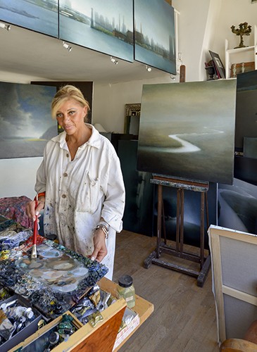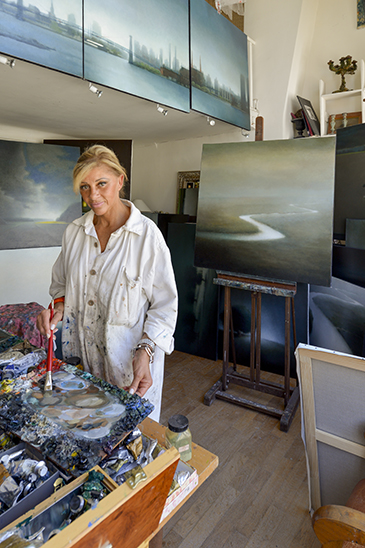 Dans son Atelier aux teintes de ses tableaux, lumineux et silencieux, où la musique accompagne la méditation du pinceau sur la toile, Berg peint.