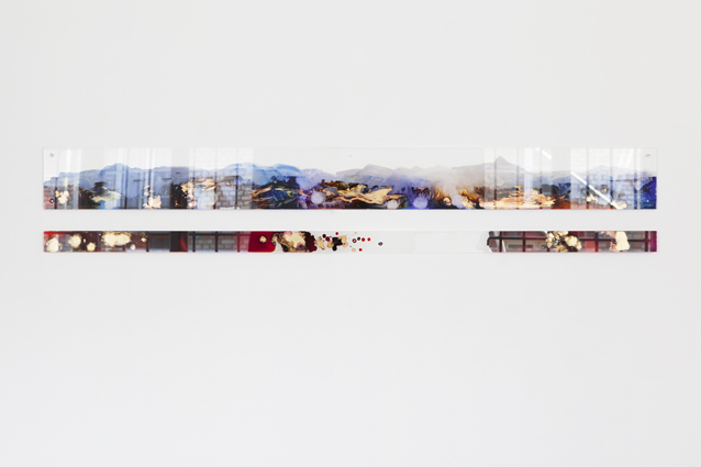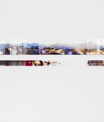 L’œuvre fait partie d’une série appelée Peintures Minérales, un ensemble d’expressions autour de la couleur confondue à une surface plexiglass. Ni mat, ni opaque, ce support a pour fonction de soutenir la couleur dans son envers pour devenir en son endroit une matière presque tangible par sa brillance et ses lumières. Comme sur une lame ou au travers d’une loupe, cette jonction donne l’effet d’une concrétion de matières qui peuvent rappeler à des paysages ou formes lyriques proche du minéral, des représentations terrestres, célestes aux effets aquatiques ou gazeux du vivant. De particules en détails, de constellations en concrétions, d’érosion en fossilisation, ce dyptique segmente et sédimente une géologie, celle de la matière, et ce grâce à une couleur qui dessine. Un bandeau pictural influant une lecture linéaire questionne la vision, le champ de la représentation et en propose une forme transversale comme pour nous rappeler à l’origine cellulaire des choses. L’architecture de ces plans constitue un langage, une matrice de lecture, pour lire l’archéologie d’une matière riche, magnifiée dans des formes insaisissables et convoque à une réflexion sur une vision abstraite de la nature qui figure indéfiniment et sur laquelle tout imaginaire peut créer.