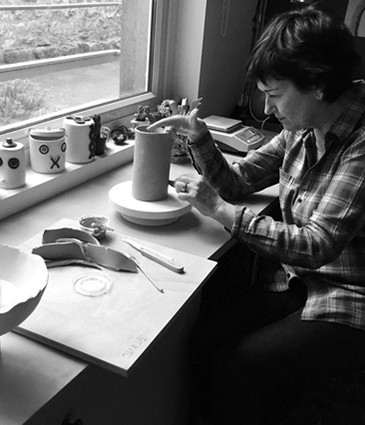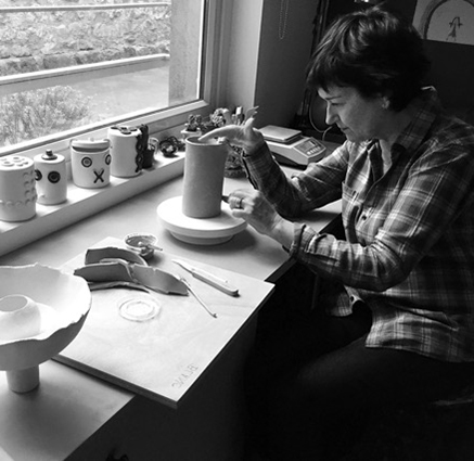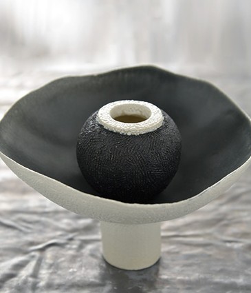 C’est une coupe /vase pour installer quelques petites fleurs ou branches dans la petite boule ouverte au centre. J’aime les fleurs modestes et les feuilles et, pour les mettre en valeur, j’ai réalisé une sorte de corolle sombre et douce.
