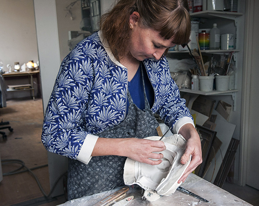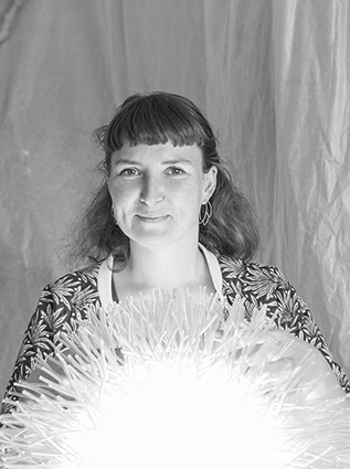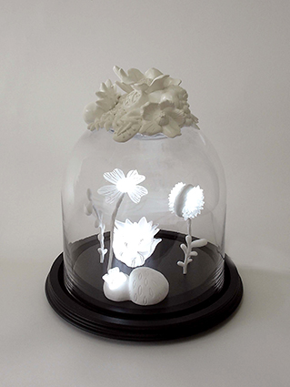 « Le cabinet de curiosité « Diaphilia » offre un paysage lumineux magique. Comme un morceau de nature fantasmée… Sous cette cloche poussent des fleurs étranges. Ces formes s’inspirent des multiples collection ».