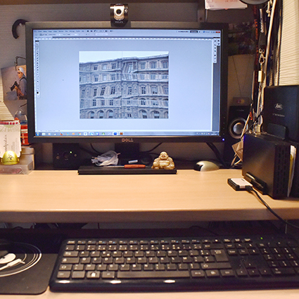 La recherche plasticienne que je mène actuellement est issue d’une investigation de la ville, elle a donné naissance à ce projet que je nomme « Réflexion Géométrique » dont cette photo fait partie. Toujours en quête d’éléments graphiques et d’un jeu coloriste, je cherche au cours de mes promenades et déplacements certains éléments du milieu urbain, formes graphiques, géométriques et cinétiques. Les immeubles à la façade réfléchissante me fournissent la matière et j’essaie de capter la deuxième image qui s’y cache. Le viseur et le cadre de mon appareil photo me révéleront cette seconde image que l’on découvre en observant et en engageant une « réflexion » devant l’oeuvre. Cette première vision venant se confronter ou s’additionner à la seconde perception ambiante. Composition où se fonde, se dilue et s’estompe une image de la ville. Image évanescente où les reflets, les couleurs et les formes apparaissent et disparaissent au gré de la lumière et de la position de l’astre solaire dans le support que forment ces édifices. Ma palette est là, il me suffit alors de déclencher et de capter la composition. Ce jeu de cache-cache avec la matière et la lumière laisse place à des couleurs et des formes qui dynamisent l’espace et ouvrent des perspectives graphiques insoupçonnables.
