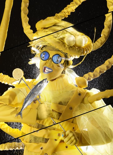 « Lu’citron… le jaune étincelant, comme la lumière, inspiré par son prénom : Lucie. Adepte de plongée sous marine, je l’ai habilléde tuyaux comme l’étaient les scaphandriers.
