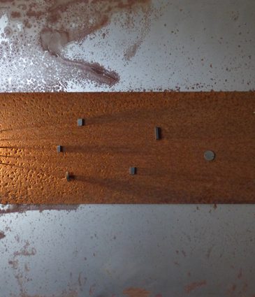 Assemblage en deux dimensions sur une plaque d’acier d’une plaque d’acier rouillé par le temps et les éléments – Clous de maréchal ferrant – aimants – spot Led.