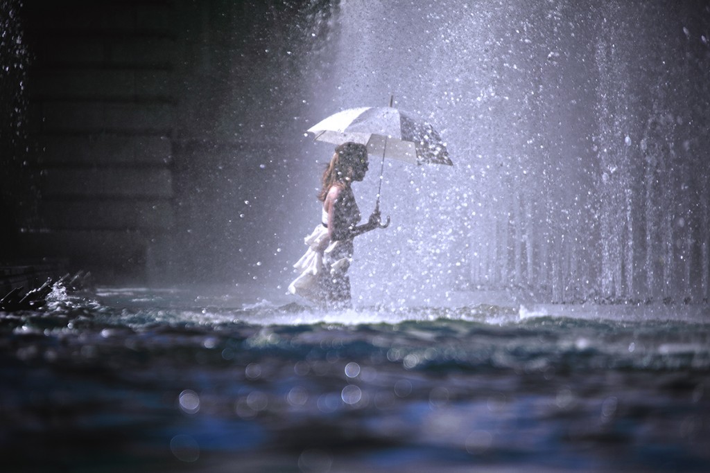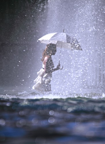 Le modèle se dessine par les formes de sa robe et de son ombrelle, mais devient, du fait des jets d’eau et du contre jour, totalement anonyme.