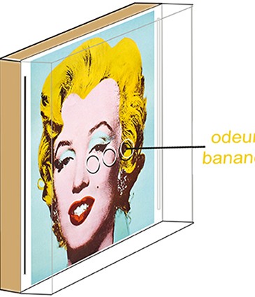 Photographies, diffuseurs de parfums, différentes odeurs, vitrines en plexiglas, cadres en bois.