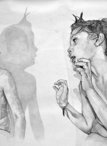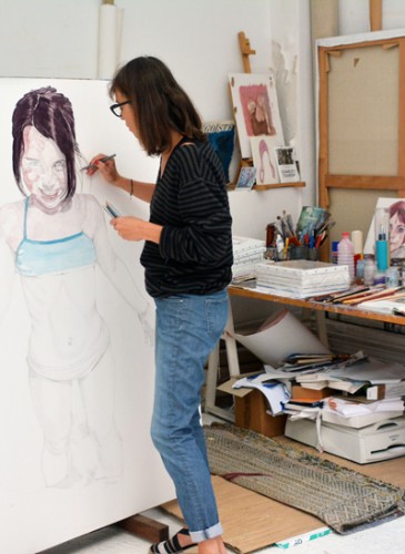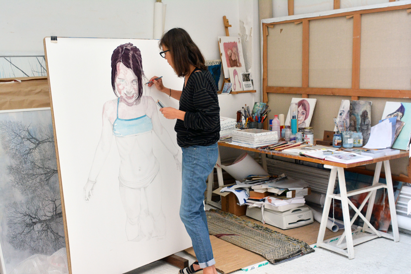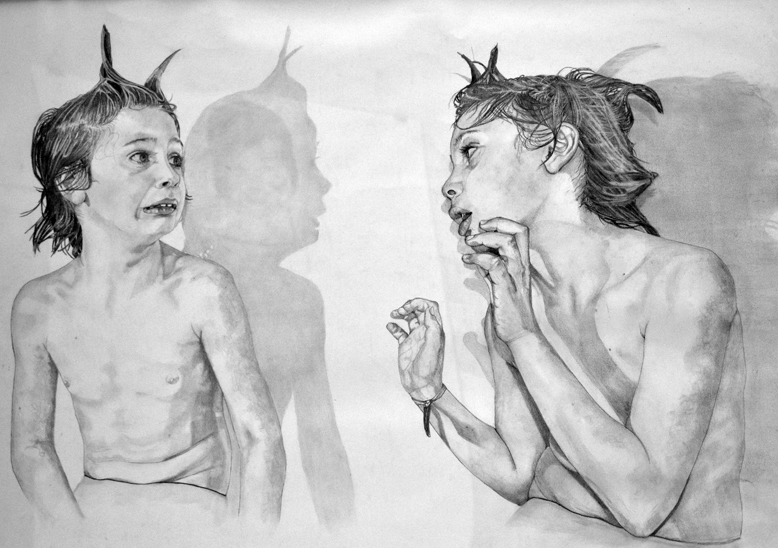 « Le trait réaliste est assez nouveau chez moi, ou plutôt le respect des proportions exactes du corps ou de l’objet. Au départ mes travaux étaient plus oniriques, narratifs. Je démarrai mon travail avec modèle ou en partant de mon imaginaire. Mes sujets étaient souvent très représentatifs, mais avec une inexactitude ou plutôt des erreurs de proportions souvent volontaires accentuant la présence, l’intention. Je n’étais pas dans la représentation stricte. »