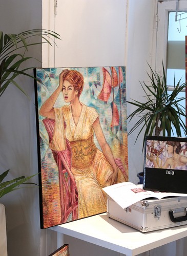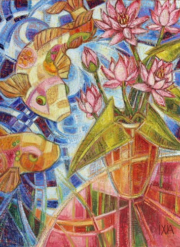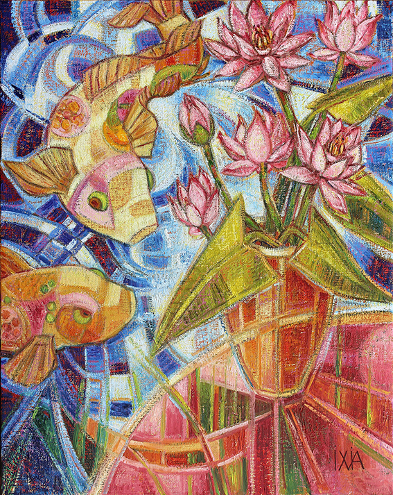 Composition d’une grande force picturale, tant dans le travail de la couleur que dans celui des plans, de la perspective. On y retrouve des symboles majeurs de la culture asiatique – la carpe, le lotus –, mis en scène par Ixia de manière originale, dans une rencontre pleine de vie et célébrant la beauté de la nature. Loin des représentations traditionnelles, la déstructuration de la lumière et des motifs emporte le spectateur dans un voyage pétri de la puissance de l’imaginaire.