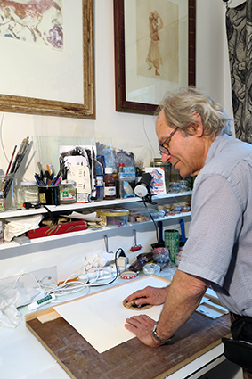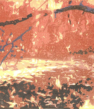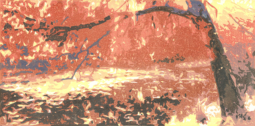 La gravure avec plusieurs bois me permet de travailler la couleur lors du tirage. Il s’agit là de la version IV de couleurs très automnales et ensoleillées.