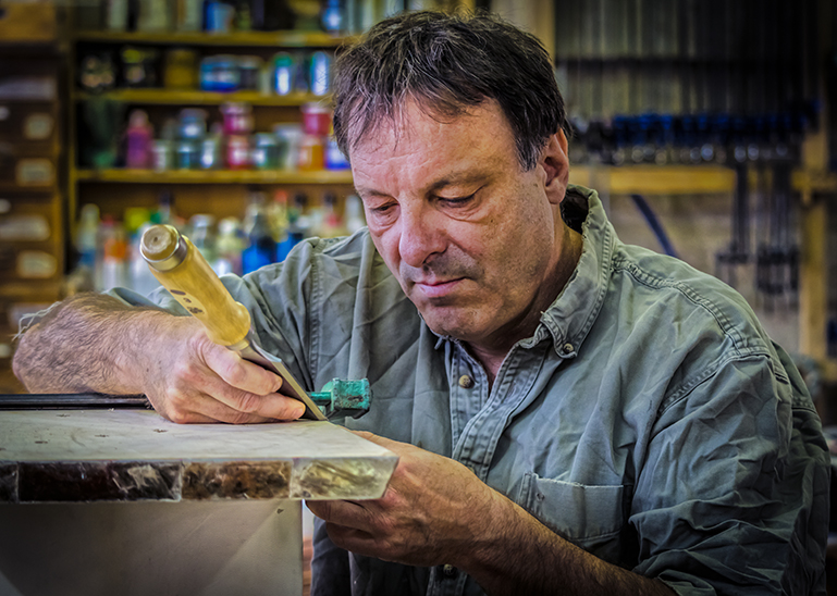 Artisan depuis maintenant 30 ans Jérôme Cordié a été formé chez les compagnons. Il s’est rapidement intéressé à la création de mobilier en parallèle de son activité de restauration ».
