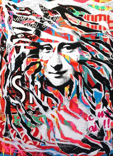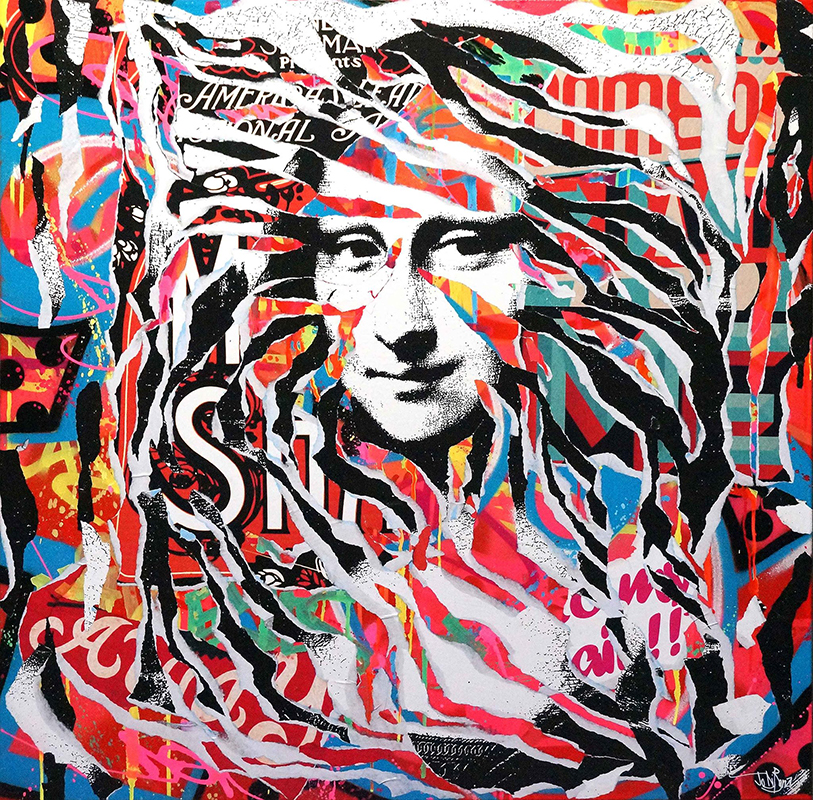 La toile devient un pan de mur arraché, une bribe de souvenir, où tout peut être intégré : les traits vifs acérés et colorés de l’aérosol flirtent avec le quotidien, le populaire, de nos magazines débordants de pubs à nos affiches qui ne trouvent leur place que sur des murs trop exigus pour les accueillir, et que plus personne ne regarde…