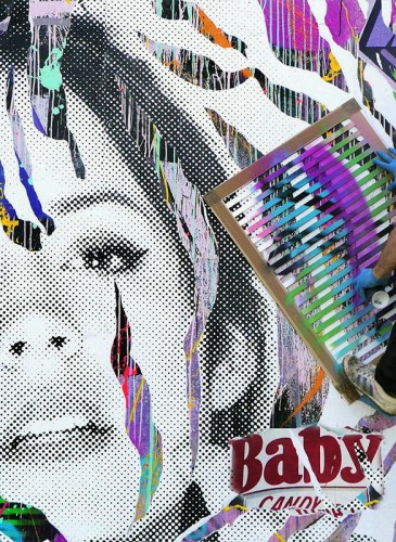expérience de Street-Artiste et son geste dynamique et nerveux avec son passé de plasticien et son amour du Pop-Art : les lettrages colorés et flashy se désintègrent en fusionnant avec quelques pochoirs, et les affiches marouflées viennent électriser l’ensemble.
