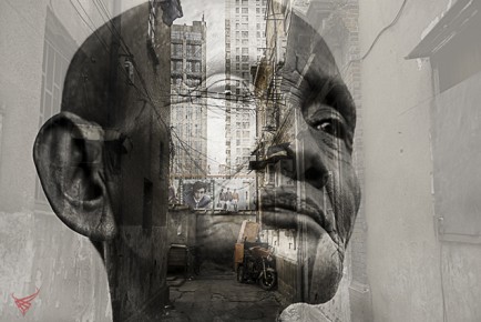 Le sujet porte un masque, crée avec un logiciel de dessin vectoriel et édité avec Photoshop, inspiré des codes esthétiques des Marvel Comics, pur produit de la culture américaine.