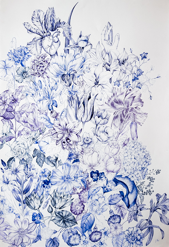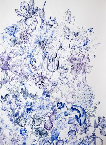 Envahissement a été entièrement réalisé avec plusieurs stylo BIC aux variétés de bleus intenses qui accentuent la profondeur du dessin. Il s’agit de « fleurs-organes » ou « fleurs-membres »qui envahissent l’espace de la feuille. Derrière la simple beauté ornementale et décorative de ces fleurs inspirées de Redouté,, célèbre graveur-aquarelliste du 17ème siècle, se cachent des hybrides, mi-humain mi végétal, venant nous déstabiliser et nous questionner sur notre rapport à la nature. On peut y voir en effet l’homme envahisseur et destructeur de la nature et de sa planète et à contrario, la nature reprenant ses droits ou encore une végétation bel et bien vivante, respirant, sentant, touchant, mordant littéralement la vie !
