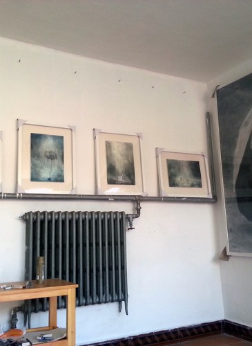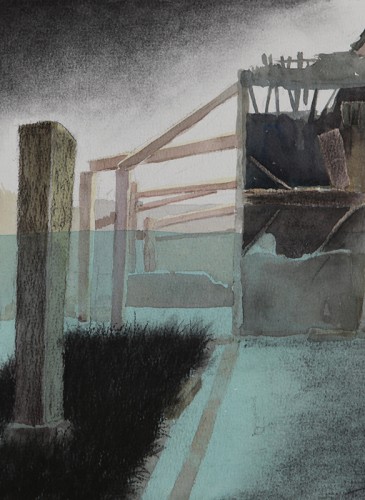 Dans la série de peinture intitulée « Construction » le peintre met en avant une approche à la fois onirique et organique du réel. A la légèreté de l’univers qui se dessine sous la transparence de l’aquarelle s’ajoute ici la texture palpable et consistante du charbon.