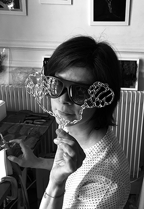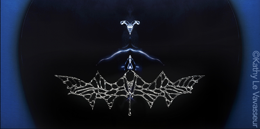 Dans la lignée des artistes qui saluent la découverte de Wilhem Röntgen avec fascination, Kathy Le Vavasseur explore « l’iconographie de l’invisible » et questionne sur l’intériorité physiologique de notre corps, sur ce qui nous échappe. Détournant les images médicales de leur but scientifique, elle s’approprie intimement des radios d’anonymes, utilisant les effets et les couleurs d’origine comme les bleus, le noir profond, découpe, recompose et crée de nouveaux dessins symétriques ou non. Elle y coud des ornements de verre, translucide, sculpté, qui jaillissent et viennent perturber la vision de ce qui est tangible ou intangible. Fragile, le verre brille, magnifiant ce qui irrigue l’intérieur du corps, ce qui participe à l’infini.