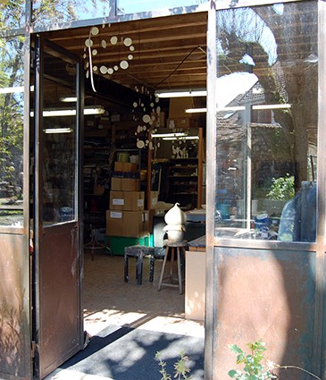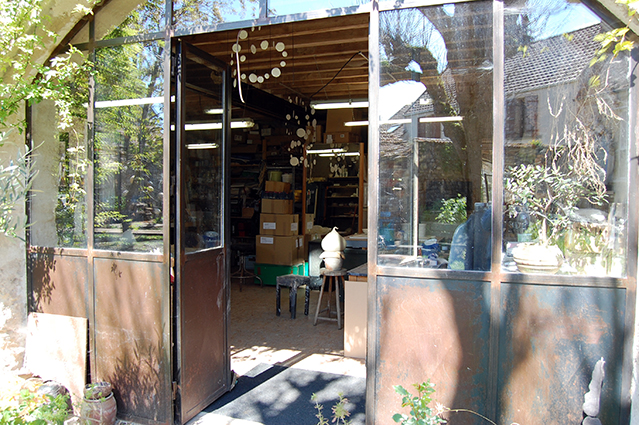 La technique utilisée : estampage de grès et porcelaine, incrustation, percement et montage sur filins de métal gaîne, cuisson oxydante 1280°.