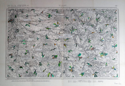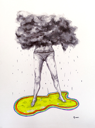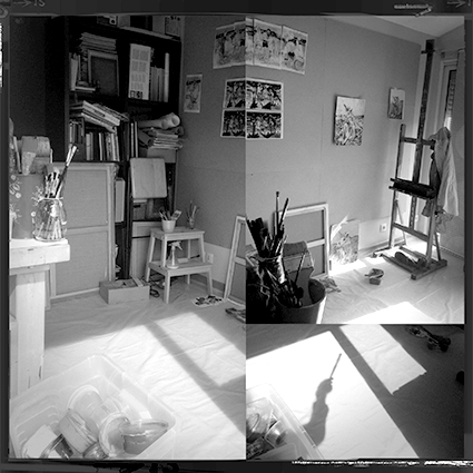 Au fil de mes recherches, photos de famille, du quotidien, images absurdes et d’actualités collectées ça et là, se côtoient ; Je les assemble, les détourne, les triture et les utilise comme supports à la construction d’une toile ou d’un dessin.