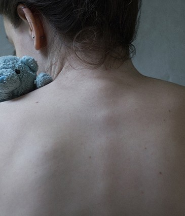 Cette photographie est issue de la série Histoires d’enfant et rentre donc dans son cadre de réflexion autour de l’adolescence et du corps. Elle doit être perçue en relation avec les quatre autres images qui composent cette série, comme une des cinq parties, comme une des cinq histoires. Des épaules, un ours en peluche, cela peut être le début de beaucoup de récits différents.