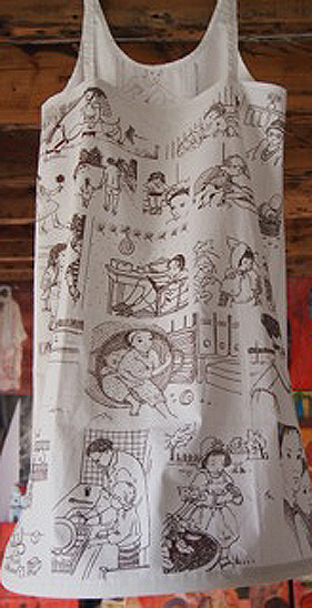 Depuis trois ans travaille sur des robes , chemises de nuit du début du XX . Redonne une deuxième vie, une mémoire oubliée à ces supports finement brodés par des personnes anonymes. Propose un dictionnaire illustré qui se dessine sur ces tissus en lin (anatomie, bestiaire, fétiche africain, poupées … )