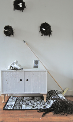 Installation à dimensions variables, meuble buffet, téléphone à cadran, ficelles, nids en cheveux synthétiques, figurines d’oiseaux, peinture acrylique