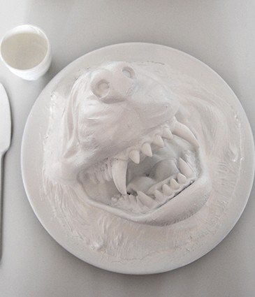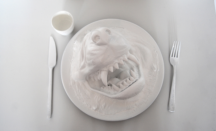 Masque de loup enragé en latex découpé et collé sur assiette en porcelaine, couverts, peinture acrylique.