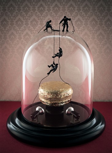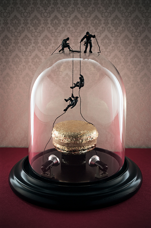 J’ai donc imaginé cette scène de cambriolage en m’inspirant de films tels que Ocean 11 et en présentant le macaron sous sa forme la plus luxueuse : Un macaron au champagne et à la feuille d’or.