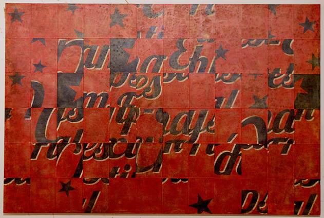 C’est mon drapeau. Comme une enseigne Texaco, avant le désert. Le rêve de l’Amérique détournée pour construire, déconstruire, reconstruire. Cette oeuvre a été réalisée en novembre 2015 pour l’exposition Colorama au Centre Culturel du Silo U1.
