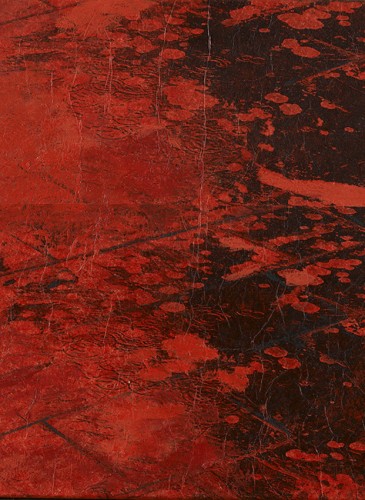 Une composition de forts contrastes colorés – le rouge et le noir – exprimée par un monde tellurique, recouvre en tourbillonnant des pavés délavés d’eau photographiés.